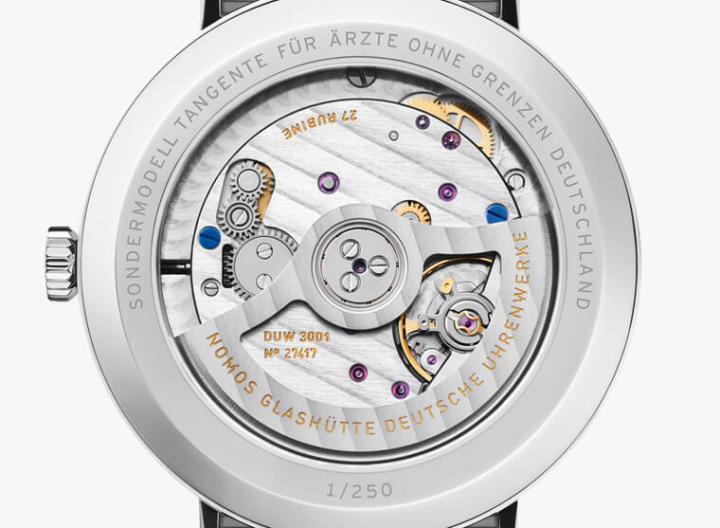 兩款表都搭載了NOMOS近年的自動機芯主力——DUW 3001,這枚機芯的優點就是在於超薄設計,雖然它是全幅自動盤設計,但整枚機芯厚度也不過3.2mm而已,同時這枚機芯也配置了NOMOS自製擒縱系統,專業制表的水準從這個細節中可以略窺一二。透過表背的透明底蓋可以欣賞到機芯的打磨與修飾,以及擒縱系統規律密緻的作動,同時注意到表背六點方向,在此也會發現每款Tangente neomatik無國界醫生系列的限量編號(各限量250隻),間接點出手錶的珍貴性以及吸引人入手的誘因。