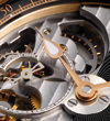 。 因此 , 這款腕錶的計時機構完全轉變到錶盤上 , 在那裡有足夠的空間放置圓柱齒輪和計時碼錶 , 而藏在時間錶盤後的擺輪只在表殼背後振盪擺的下面可以看到 。 這款整個外殼46毫米厚粉紅色或白金色的腕錶重新詮釋 , 經由經典的精妙處理 , 另有裝飾凸耳的螺紋黑鋯石等超現代細節 。 這款腕錶絕對成功 , 是非凡創意與精湛技藝結合的成果 。