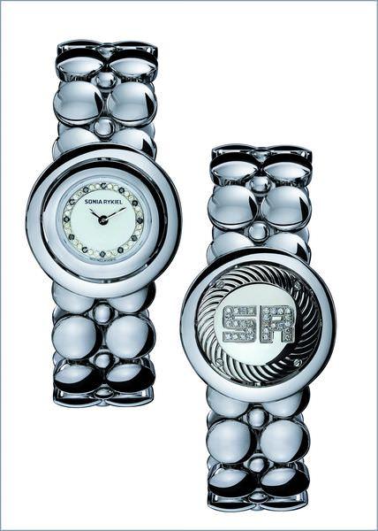 不鏽鋼表配Ronda 762 石英機芯。小時和分鐘,鑲鑽錶盤,後蓋雕有Sonia Rykiel 的『SR』商標並鑲鑽。