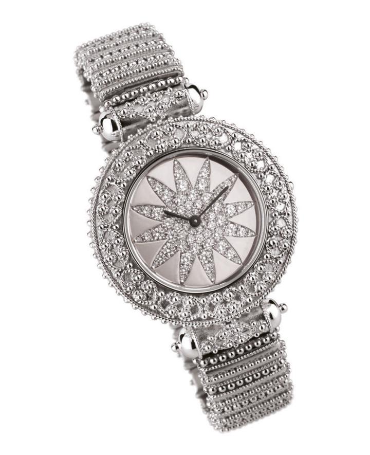 總部位於瑞士意大利語區提契諾州的珠寶品牌Matthia’s & Claire推出的Etrusca腕錶,結合了伊特魯里亞文明的粒化工藝與寶石鑲嵌工藝。34毫米白金表殼和表鏈上綴滿數千個焊接固定的金質微粒,18K白金錶盤鑲嵌68顆鑽石(總重0.95克拉)。Etrusca腕錶另有鱷魚皮錶帶可供選擇。